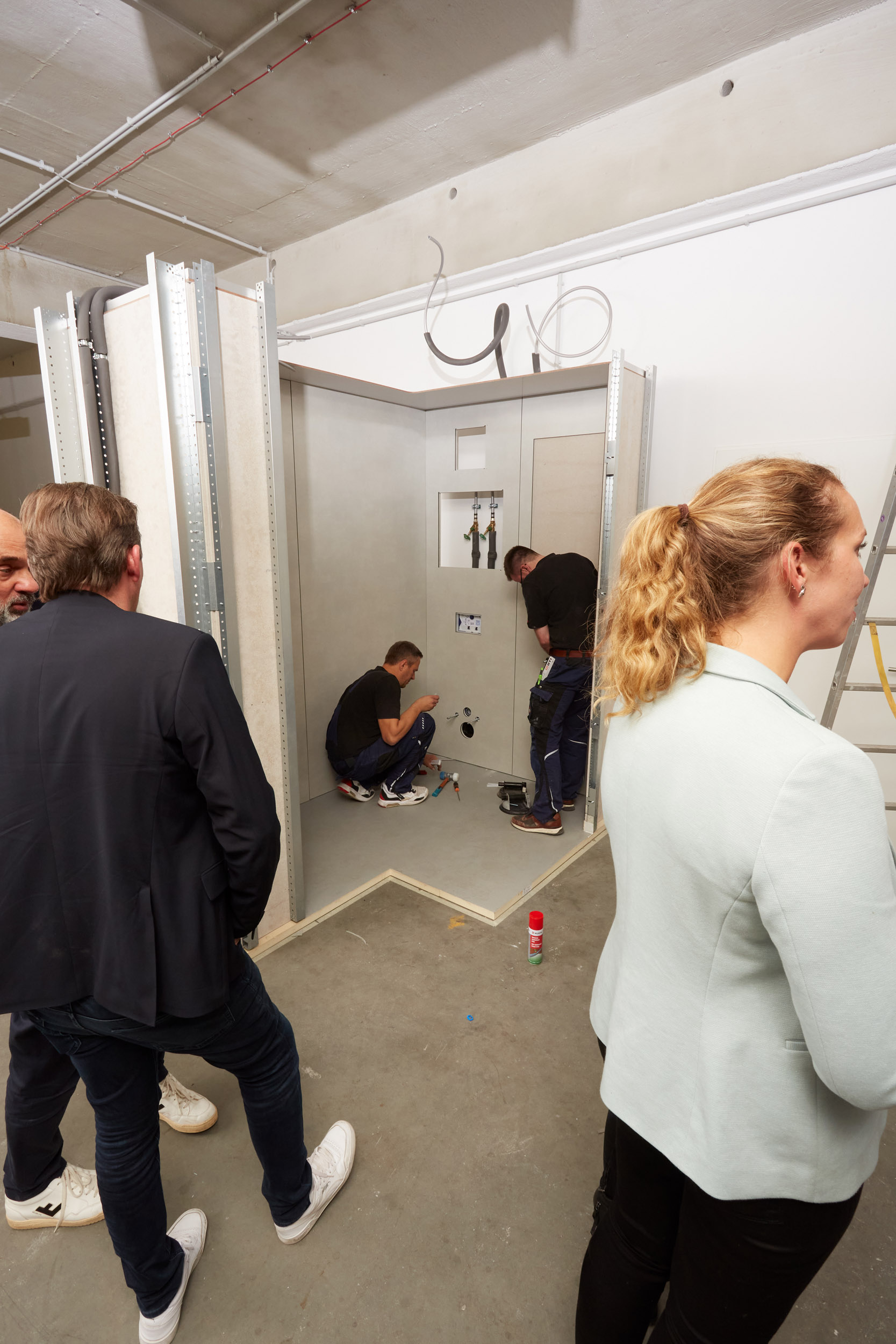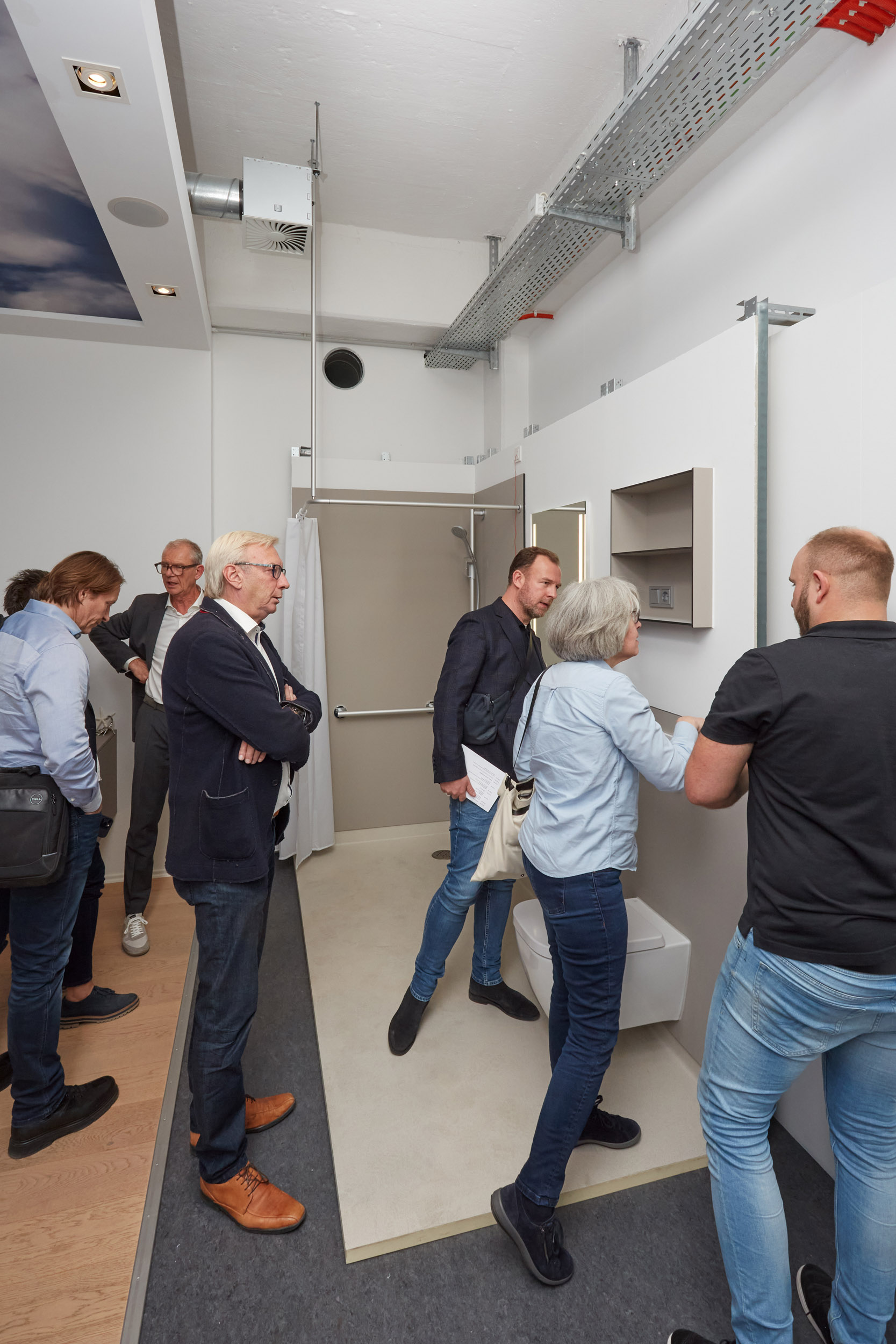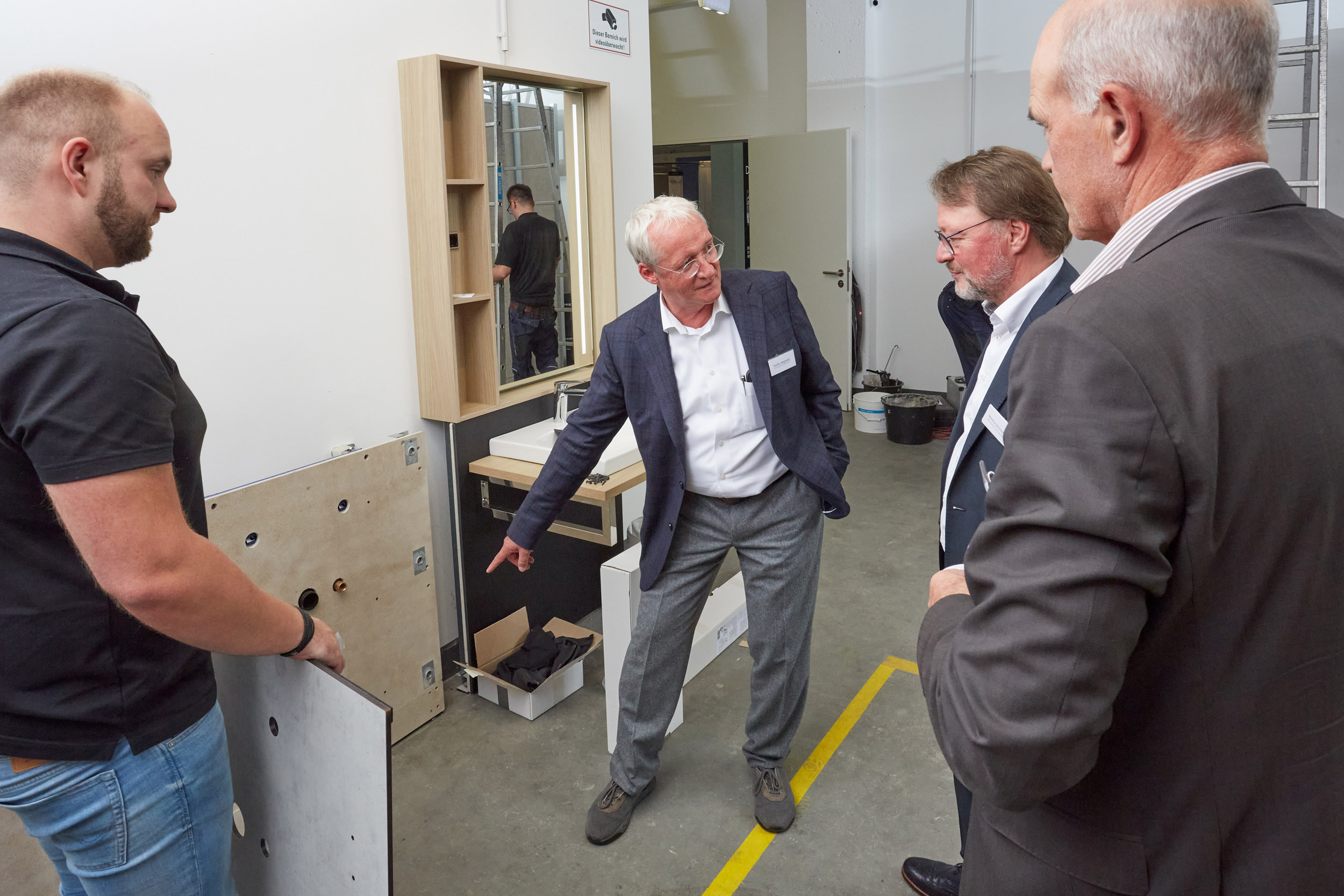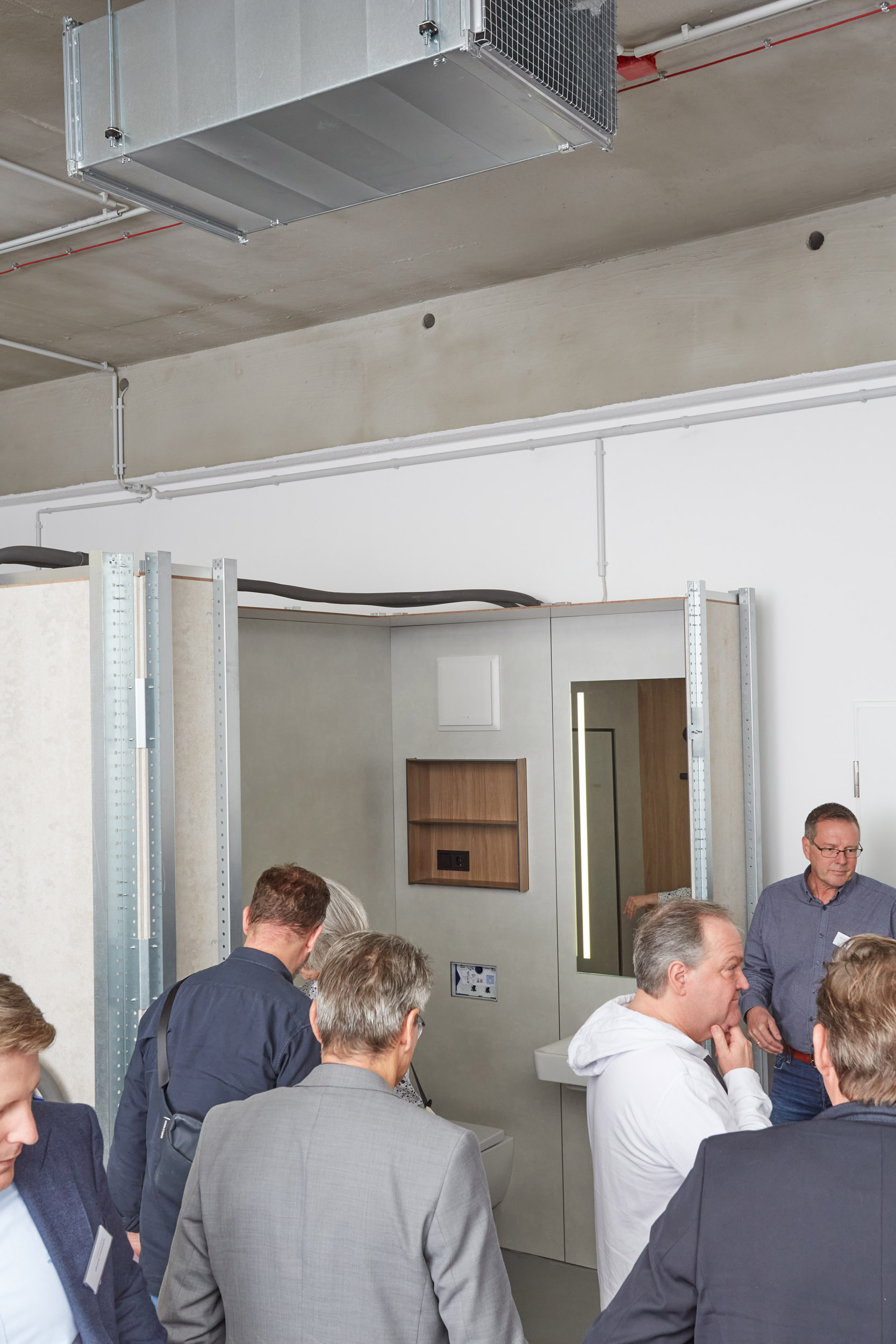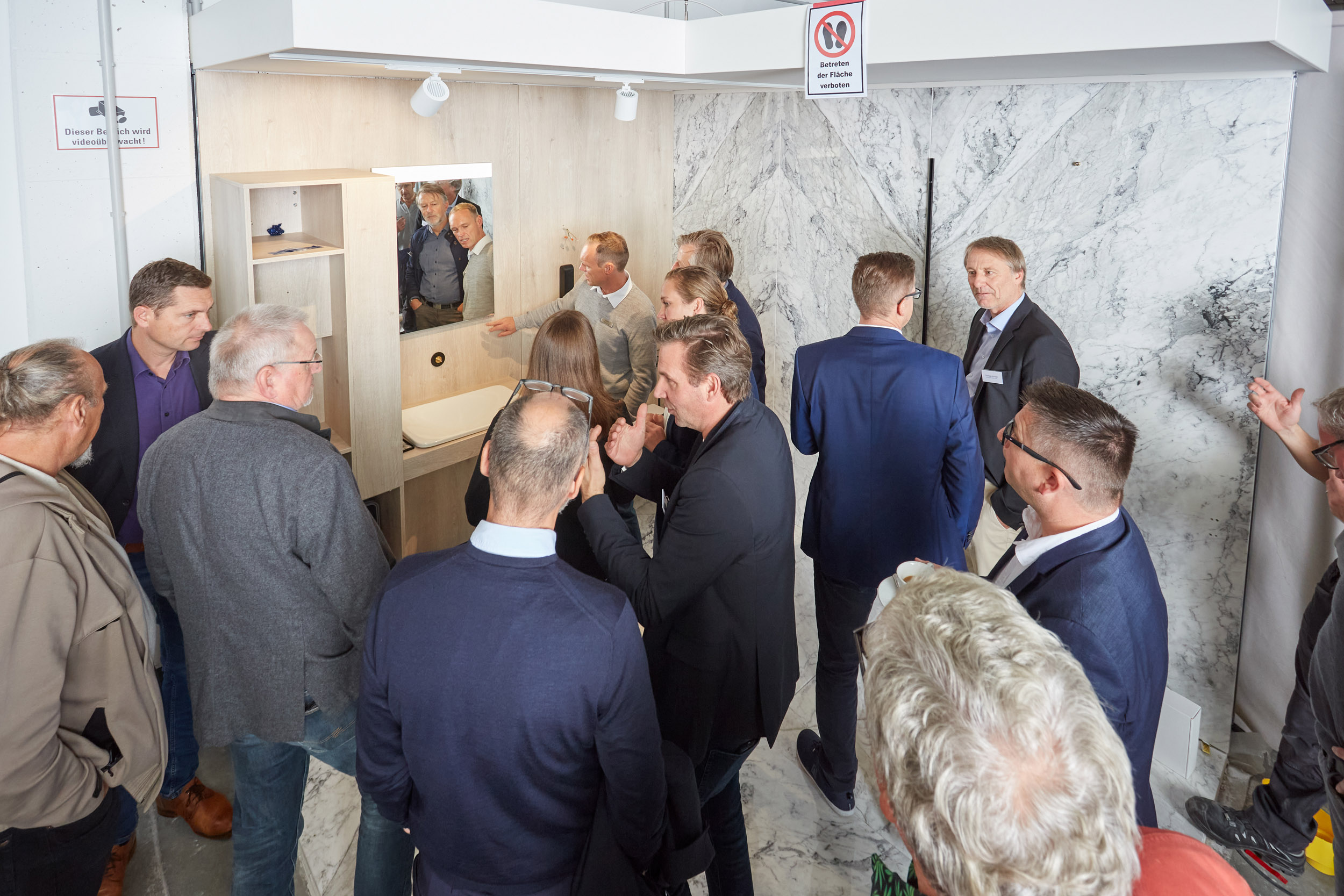 Von der Geschwindigkeit und Effizienz im Modulbau konnten sich die Teilnehmerinnen und Teilnehmer sogar live vor Ort bei KEUCO überzeugen: Während der Veranstaltung wurden zwei unterschiedliche systemische Lösungen für das Bad von BADIA, der Gerloff-GmbH und der IBS-GmbH innerhalb weniger Stunden auf der KEUCO Workshopfläche aufgebaut. Diese Lösungen mit hohem ästhetischem Anspruch sind für fast alle Objekttypen, wie Hotel, HealthCare, Office, Living, studentisches Wohnen oder Apartments geeignet. In der Kooperation sind Lösungen vom geförderten Wohnungsbau, Klinikbäder für gesetzlich – und privat Versicherte, Luxusbädern u.v.m. realisierbar.