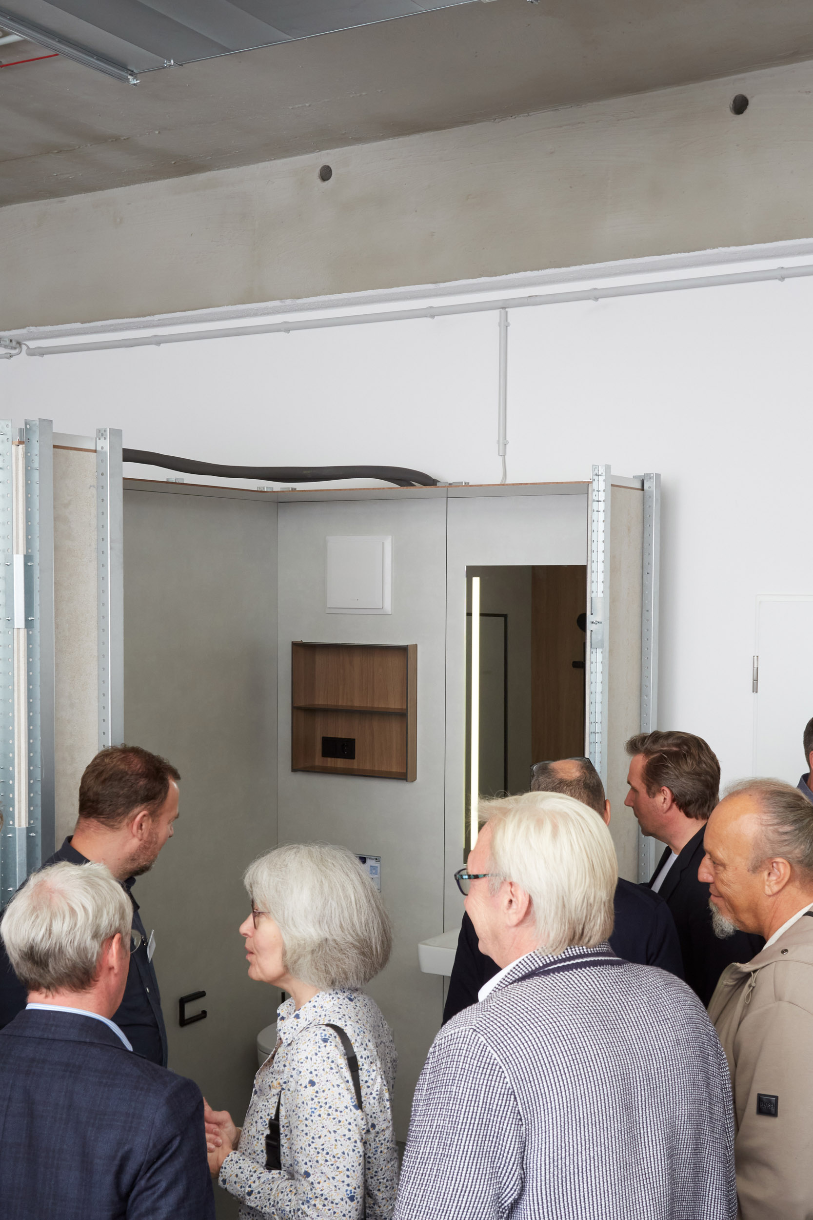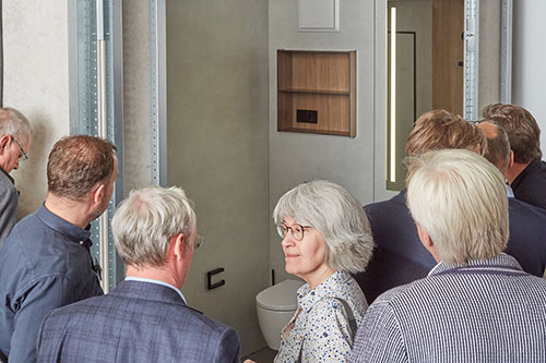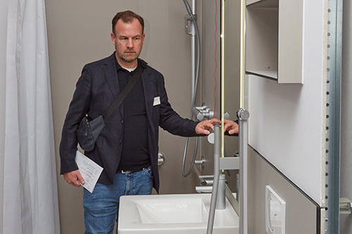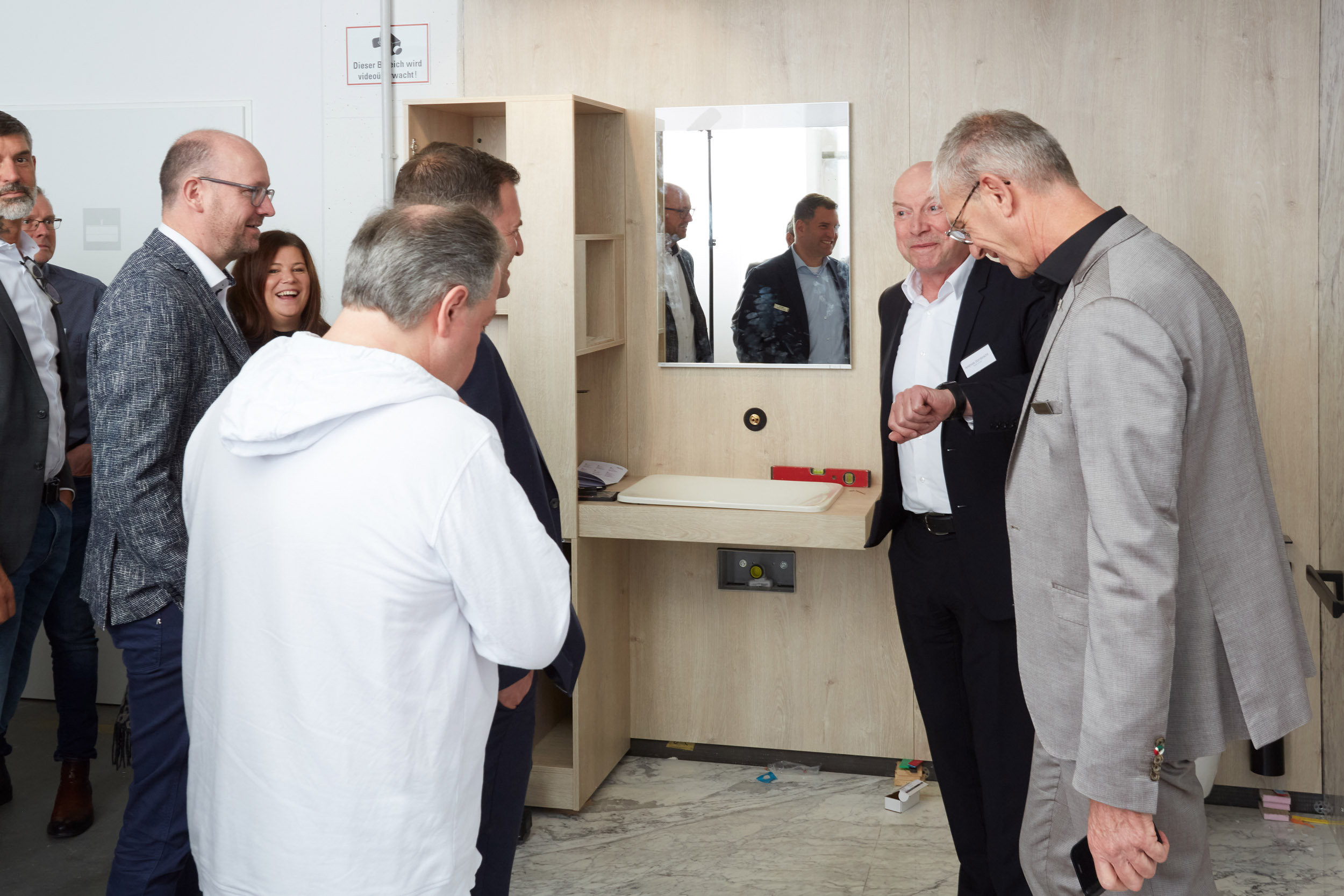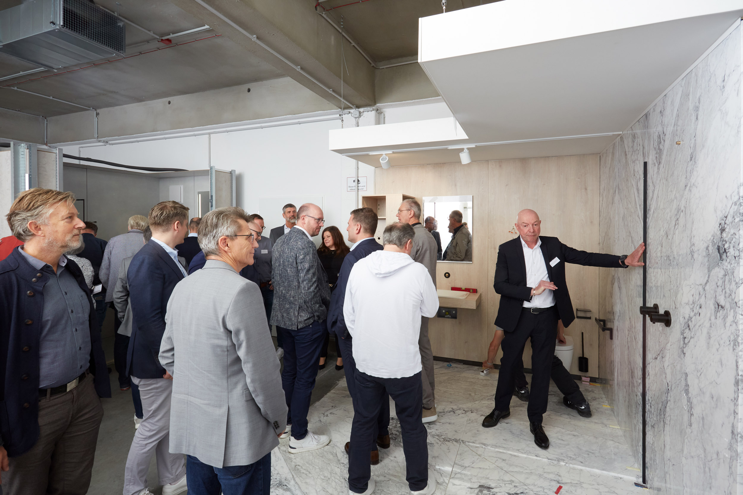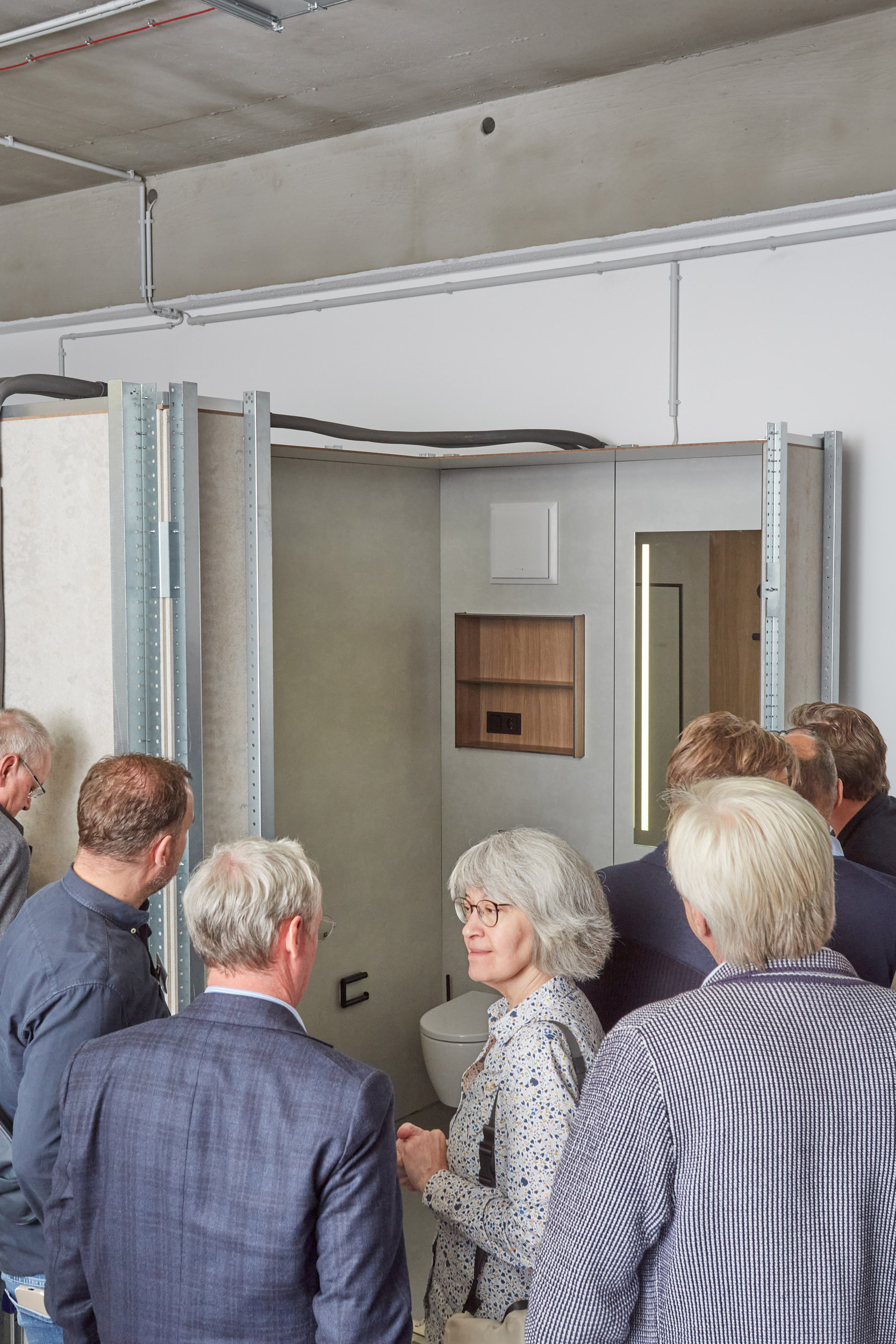 Von der Geschwindigkeit und Effizienz im Modulbau konnten sich die Teilnehmerinnen und Teilnehmer sogar live vor Ort bei KEUCO überzeugen: Während der Veranstaltung wurden zwei unterschiedliche systemische Lösungen für das Bad von BADIA, der Gerloff-GmbH und der IBS-GmbH innerhalb weniger Stunden auf der KEUCO Workshopfläche aufgebaut. Diese Lösungen mit hohem ästhetischem Anspruch sind für fast alle Objekttypen, wie Hotel, HealthCare, Office, Living, studentisches Wohnen oder Apartments geeignet. In der Kooperation sind Lösungen vom geförderten Wohnungsbau, Klinikbäder für gesetzlich – und privat Versicherte, Luxusbädern u.v.m. realisierbar.