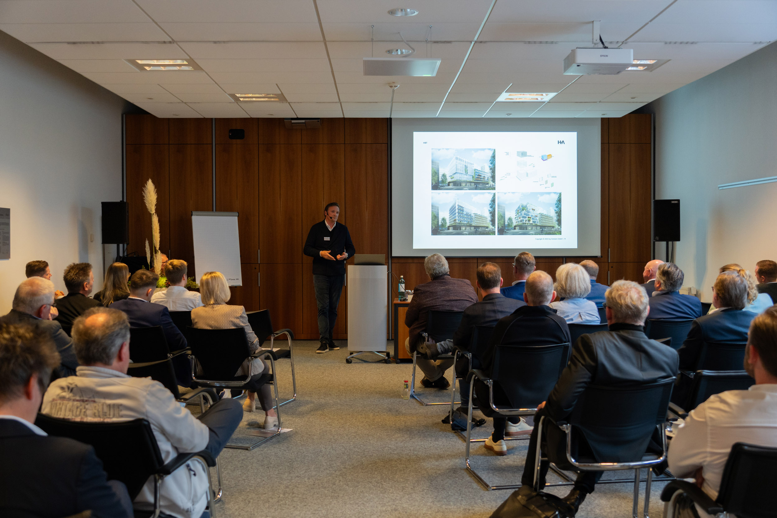 Zu Beginn setzte Christian Haak, Strategie- und Veränderungsexperte, viele Impulse aus der aktuellen Situation hin zu unserer Zukunft. Dabei unterstrich er, dass das Thema der Nachhaltigkeit ganz wesentlich für den Erfolg von Unternehmen ist und bleiben wird. Dabei solle es nicht nur bei Lippenbekenntnissen bleiben. Er betonte: „Entscheidend ist, dass wir ins Handeln kommen.“ Emanuel Homann von Homann Architects aus Brilon begeisterte mit seiner Idee von der Zukunft, der Innovationskraft des Einzelnen und der Digitalisierung des Bauens. Weitere Vorträge zeigten, dass auch gerade in Corona-Zeiten neue Wege eingeschlagen wurden. So entwickelte Matthias Wiehlpütz die MDL expo International GmbH vom Messebau zum Modulbau und auch Yannis Beier, von beier baudesign, nutzte die Zeit der Veränderung mit der kreativen Auseinandersetzung und dem Entwickeln von Projektkonzepten im nachhaltigen modularen Betonbau. Details zur konkreten Umsetzung solcher Projekte lieferte Irina Edel, Projektmanagerin von maxmodul der Firmengruppe Max Bögl. Spannend war der Einblick in die Produktion und Logistik von Großprojekten im Modulbau. Andreas Dornbracht, geschäftsführender Gesellschafter von BADIA, präsentierte das Lösungssystem Bad, einer Kooperation von BADIA, der IBS-GmbH und Gerloff GmbH sowie KEUCO.
