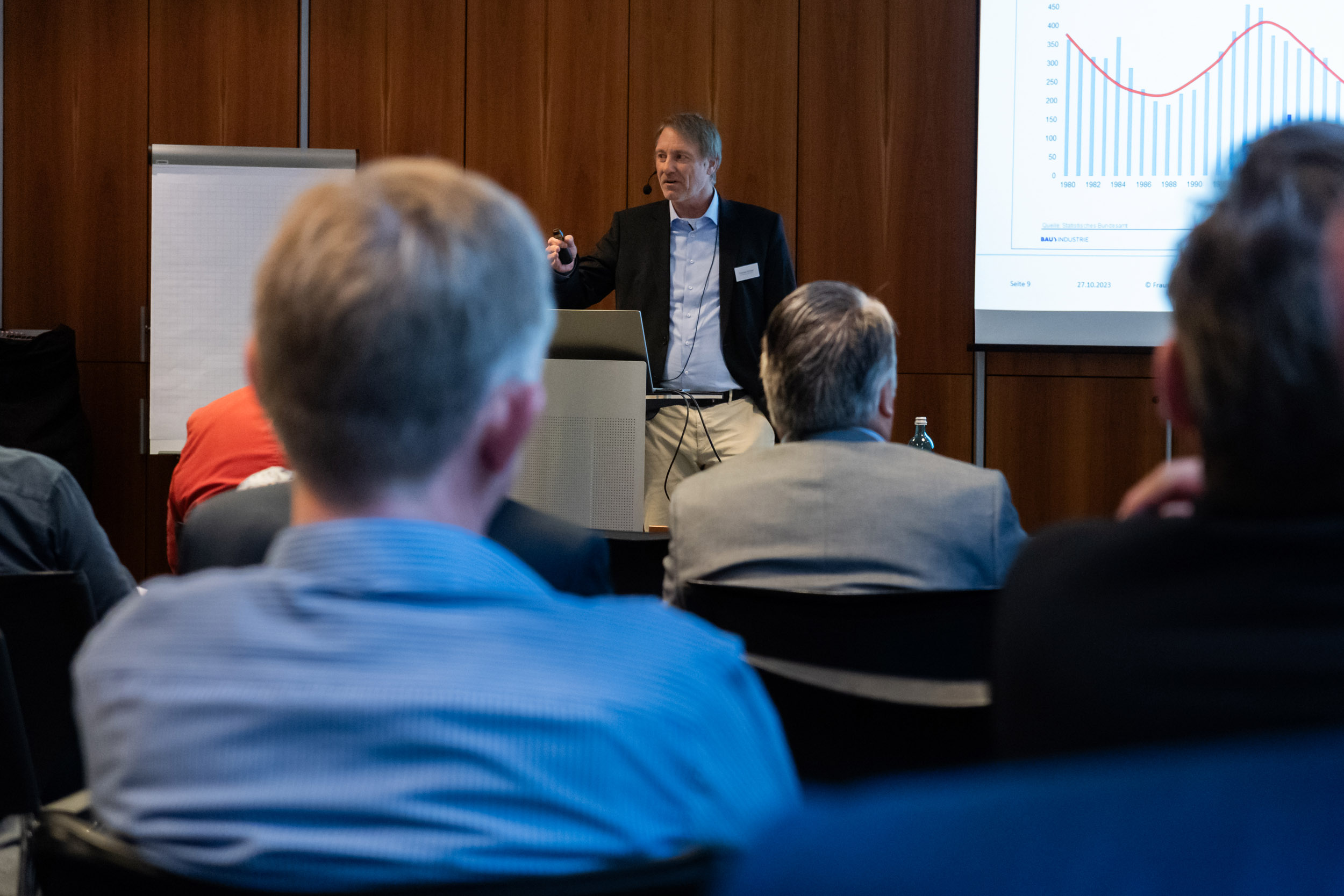 Thomas Kirmayr, Geschäftsführer der Fraunhofer-Allianz-Bau sowie Leiter des Mittelstand Digital Zentrums schlug am Ende den Bogen zum technisch Machbaren, mit dem Hinweis auf zahlreiche Forschungsprojekte, neue Materialien und Technologien. Dabei zeigte er die Möglichkeiten auf, wie man z.B. Beton nachhaltig recyclen und wiederverwenden kann und wie Module aufgebaut sein müssen, damit sie auch für den Rückbau geeignet sind.